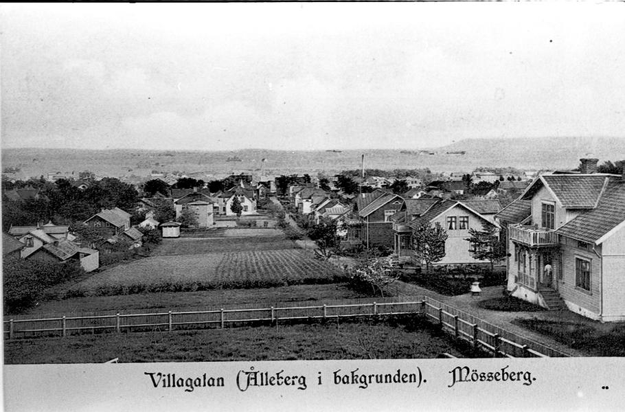 Villagatan, till vänster Lidgatan med Mössebergsparken. Villan med tre små fönster högt upp är Villagatan 6, till höger Villagatan 19.