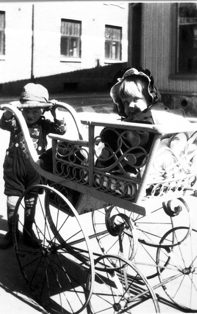 Sven Adolphsson med syster Britta i barnvagn 1932.
