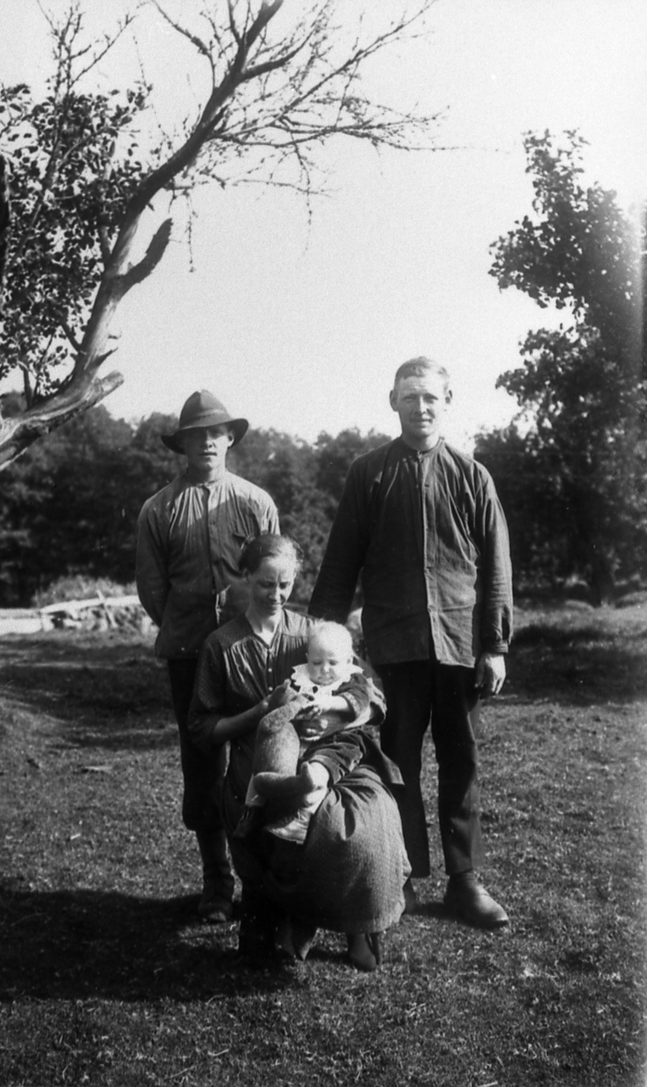 Oskar, Hanna och Arne andersson i Vist. T.v. drängen Hjalmar. Oskar arrenderade här men flyttade till Västorp Bryngelsgården.
