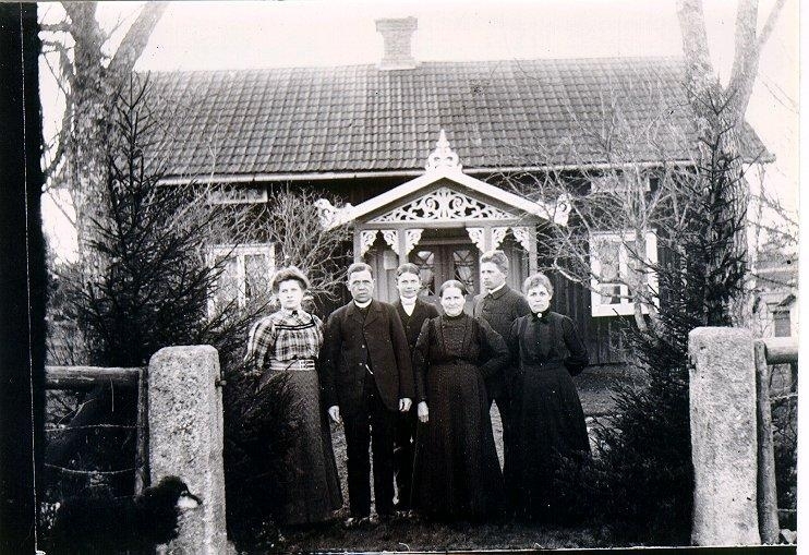 Aspelund. Personer från vänster: Maria Johansson, född 1891, senare gift Pettersson. Josef Johansson. Anton Johansson, född 1894, ägde sedan Aspelund. Stina Johansson född Adamsdotter, född 1851. Birger Johansson/Warrén, Tilda Johansson, född 1863. (Kusin till Josef Johansson) Aspelund. Hunden heter Max Bostadshuset är byggt 1882, ombyggt och renoverat 1925.