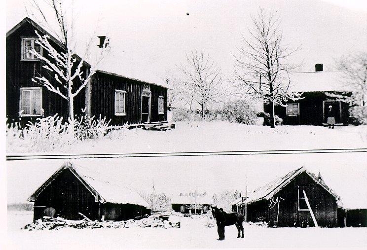 Drygstorp (Drystorp), Gudhem, slutet av 1920-talet. Mannen vid hästen heter Gustav Karlsson. Damen vid lillstugan är Karin Andersson, sedermera Gustav Karlssons fru. Mangårdsbygggnaden revs 1936 och nybyggdes 1937, ladugårdarna som var med halmtak revs omkring 1970 men lillstugan finns kvar.