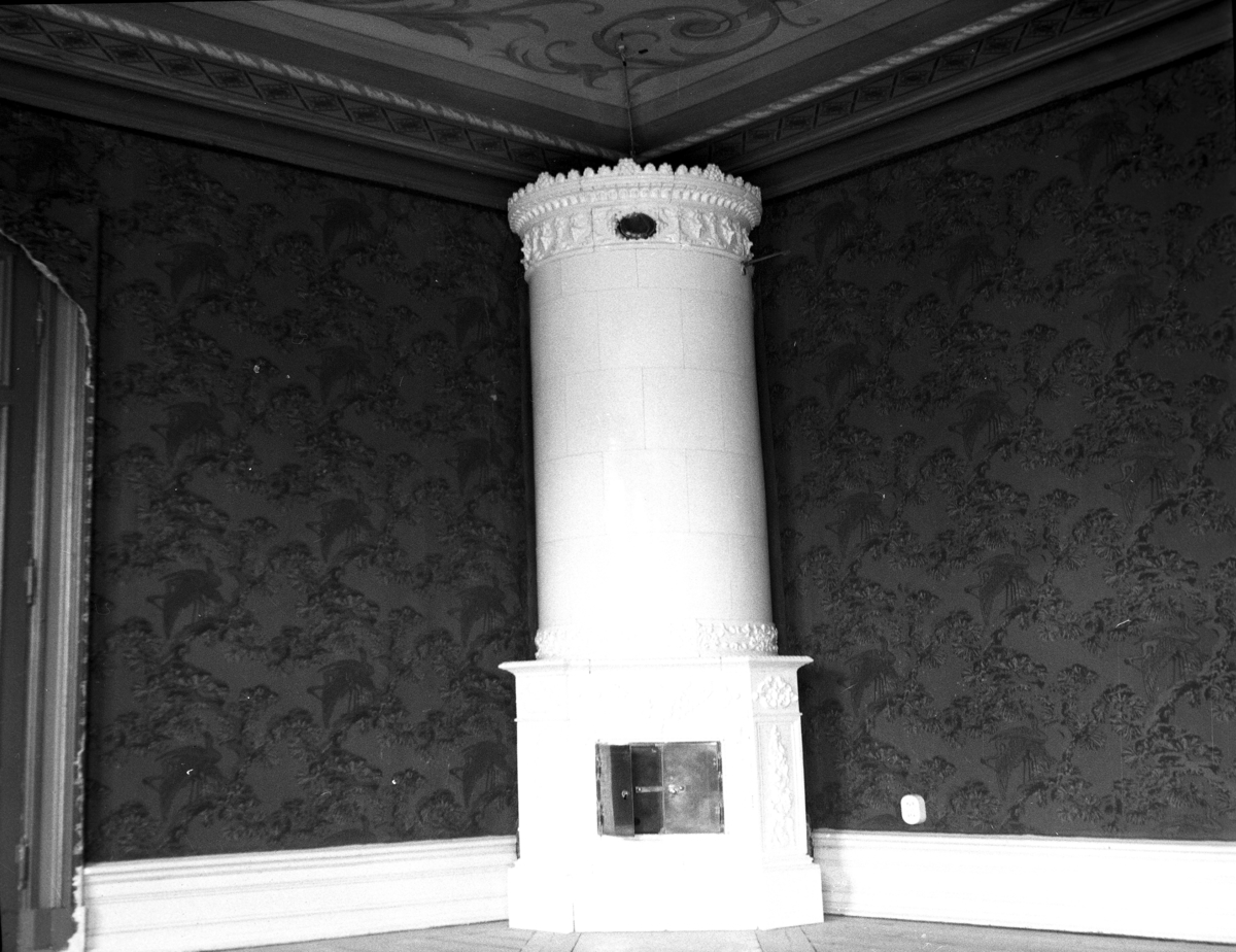 Kv. Guldsmeden. Storgatan 18, Per Lars tomt, revs 1957. Kakelugn i stora salen i huvudbyggnaden 1 tr. upp.