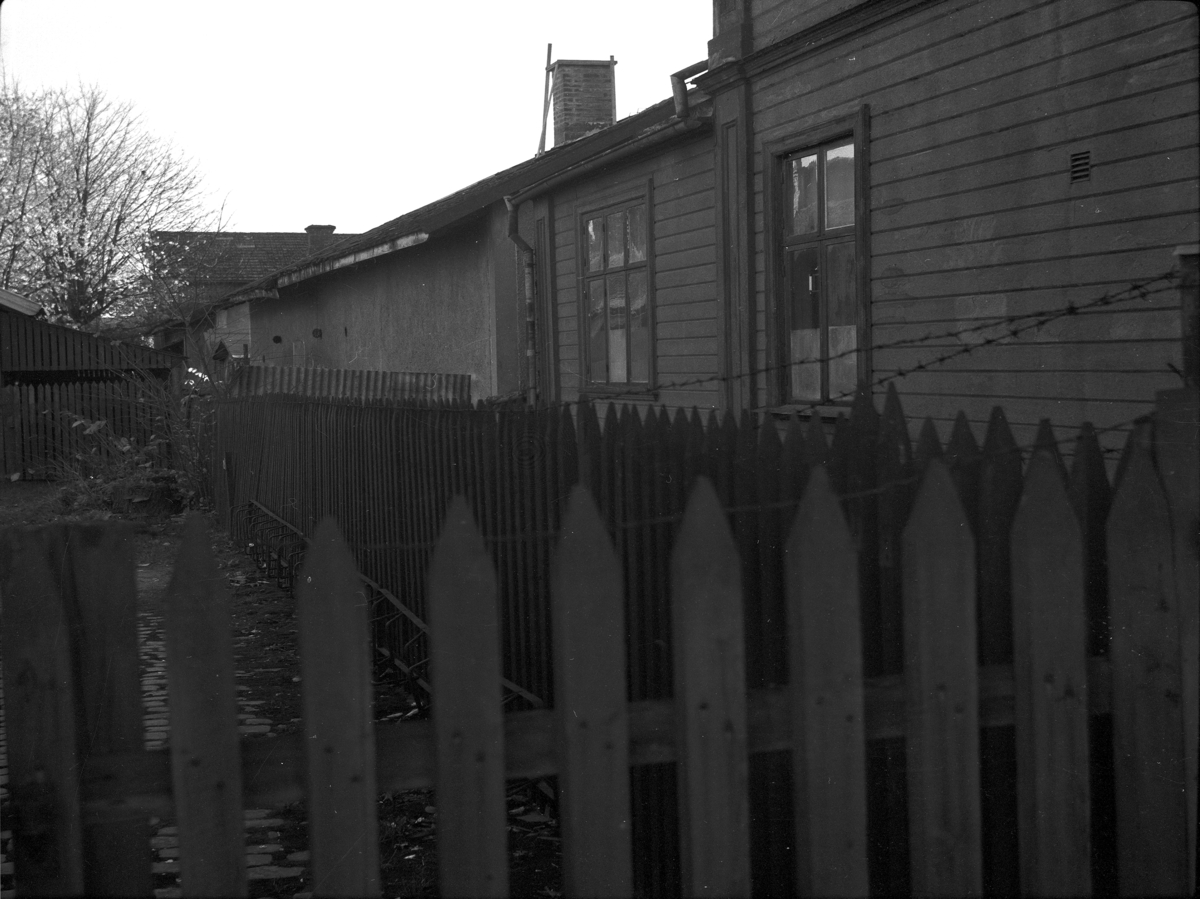 Trähuset åt höger är troligen Eskilstunaboden, f.d.Fahlströms hus. Foto fr. Järnvägsgatan mot Falegatan. Samtliga byggnader revs 1967.