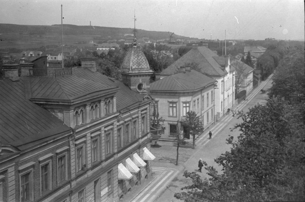 Titel: Vy över Järnvägsgatan (nuvarande S:t Olofsgatan) och Falköping med Mösseberg i bakgrunden.