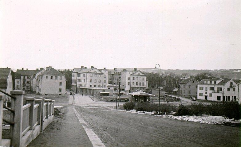 Kv. Midgård, Bryngelsgatan vid skärningen med Botvidsgatan. Telegrafverket till höger. Bensinstation i förgrunden.