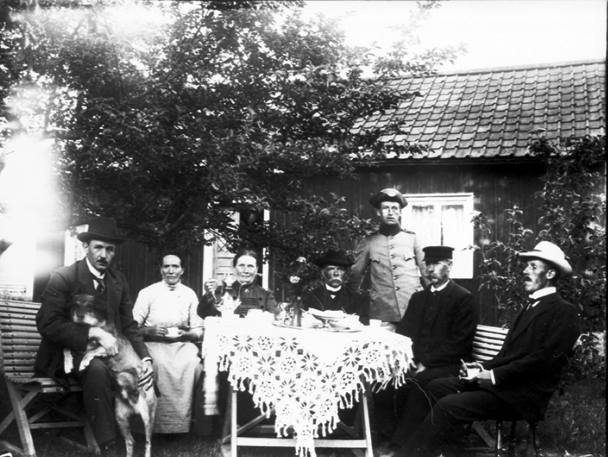 Hos Fälts i Bossgården. Amandus Fält med hunden Tipp, hush. Augusta Båge, två okända, August Edvard Fält och Karl Fält. Bakom står Ture Fält.