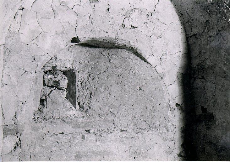 S:t Olofs kyrka. Restaureringen 1958-1961. Koret. Den romanska ytterportens igenmurning, överdelen, sedd inifrån innan flisorna i ljusgluggen borttagits. Den gamla putsen ännu ej behandlad.