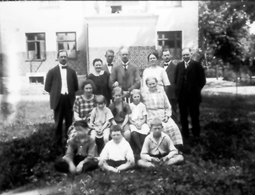 Skaraborgsbanken. Stående Artur Nilsson, hans syter Ingeborg, en banktjänsteman från Slutarp som hette Rånge, Hjalmar Nilsson, Ester och David Karlsson, skogsvaktare Oskar Nilsson. Sittande Gertrud N, dottern Anna-Lisa, Stina Pettersson, Margit N, Ellen N. Barnen Kalle Åke och Stig Nilsson.