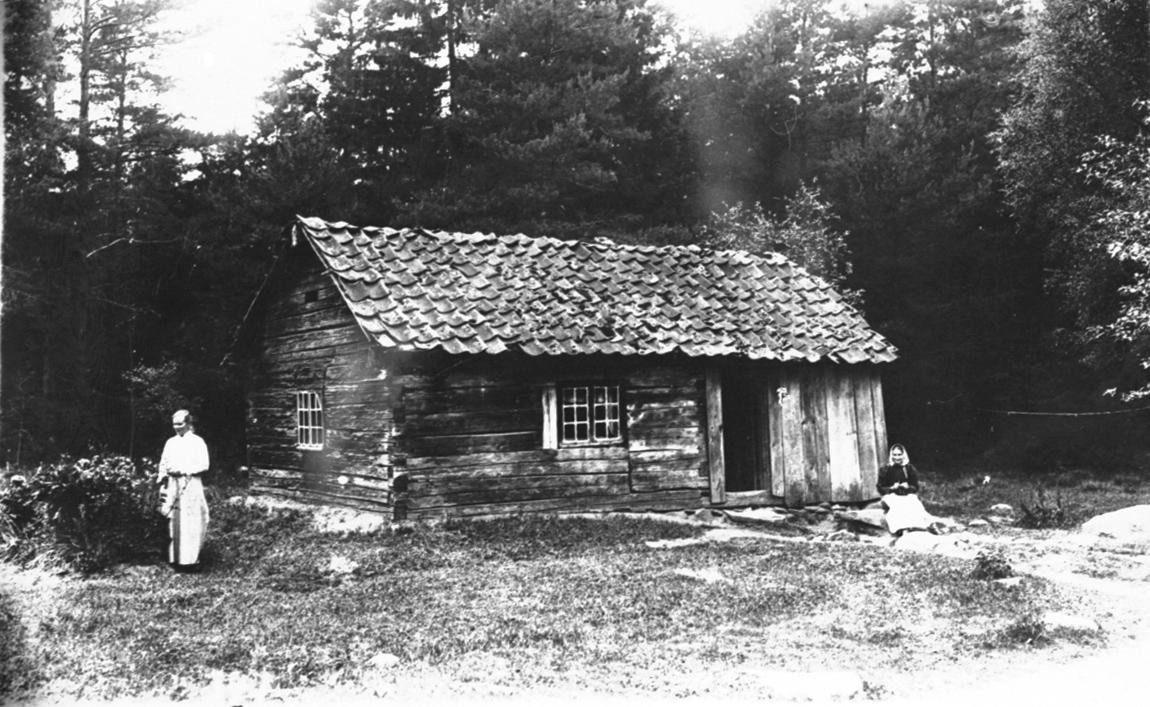 Gammal stuga. Enkel stuga med både resvirke och liggande timmer, tegeltak.
