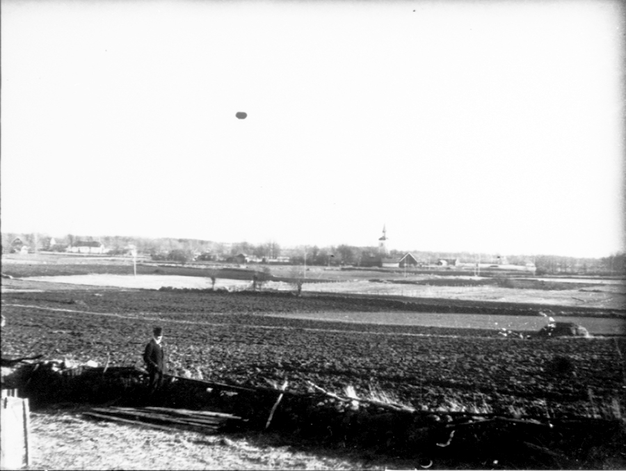 Floby kyrka sedd från Bossgården. Smältebäcken svämmar över.