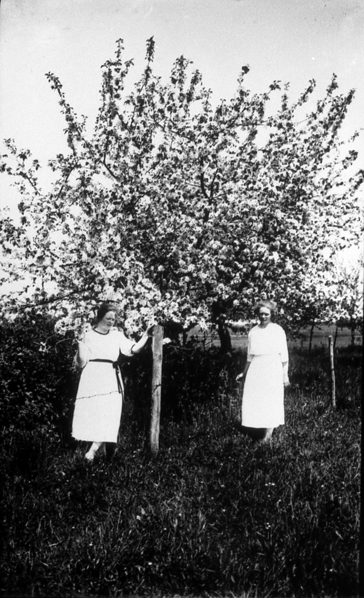 Ebba och Berta på Veken vid ett blommande körsbärsträd.