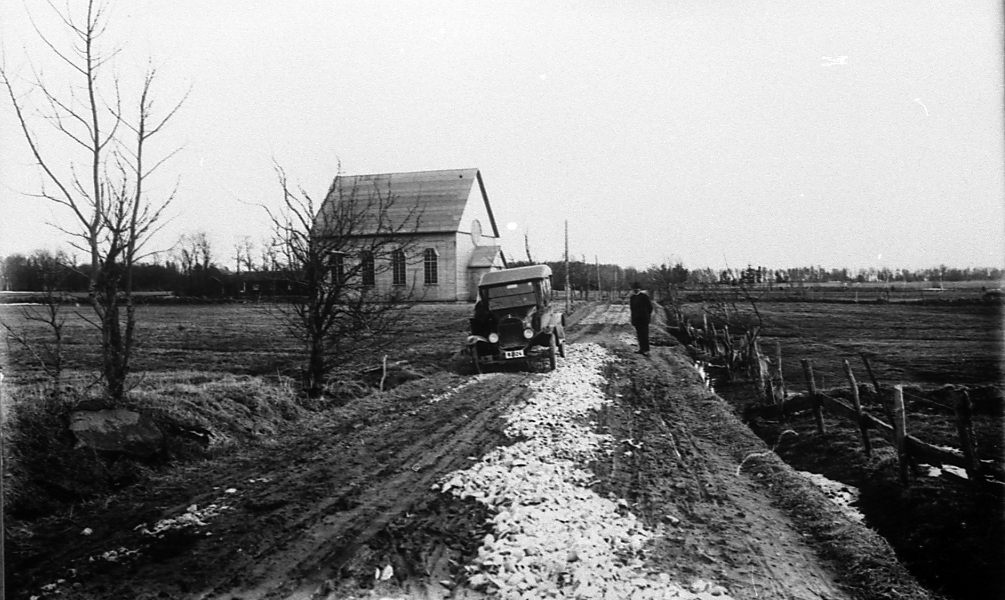 Vägen förbi EFS-kapellet. Rikard Ahlströms bil har fastnat i makadamen som lagts som en sträng på vägen.