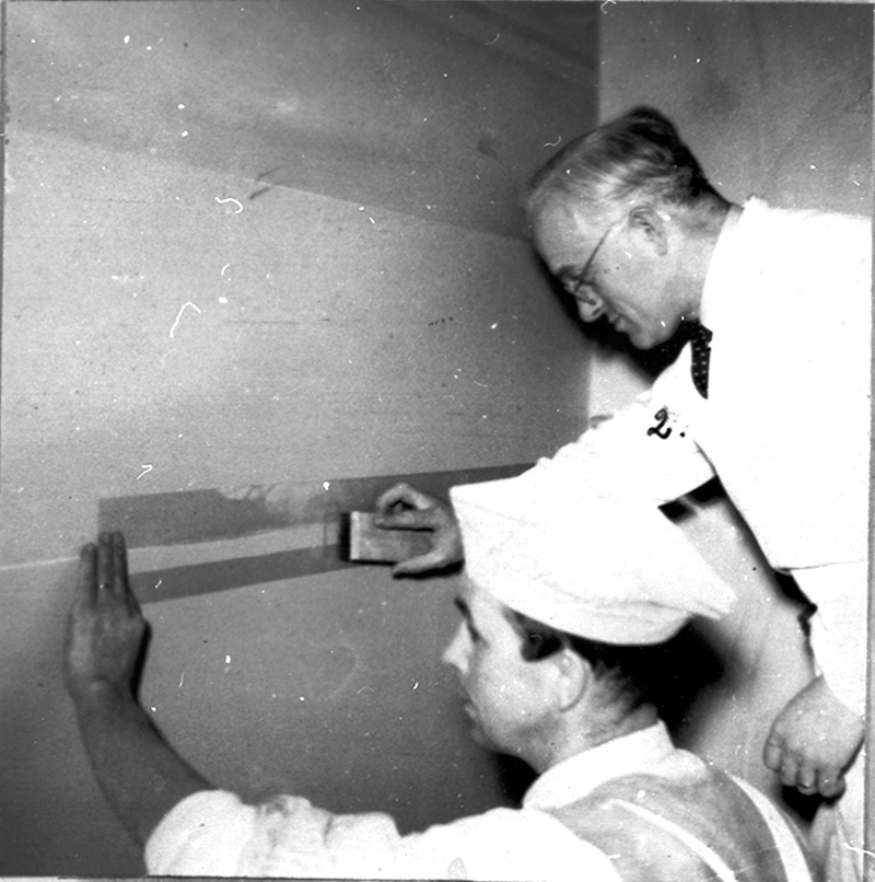 Sten Rudh får instruktion om brokadmålning av färgkonsulenten.