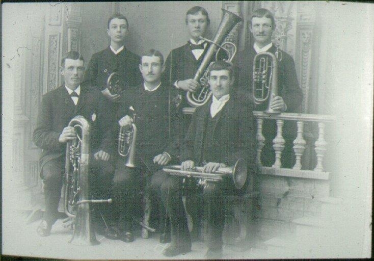 Järnvägsmännens musikkår. Från vänster: stående: Per Sköld, Carl Noring, Oskar Gustavsson. Sittande: Erik Larsson, Rick och Albin Sahlgren.