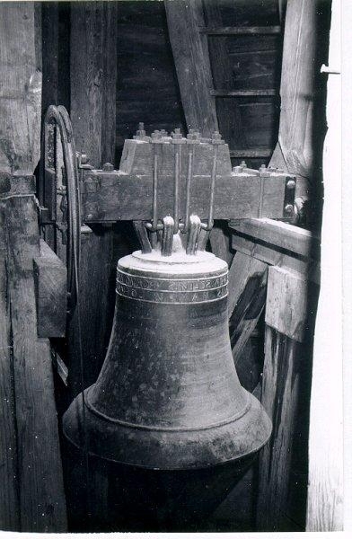 S:t Olofs kyrka. Kyrkklockor. Lilla ringklockan i S:t Olofs kyrka. Omedelbart under stora hjulet för el-ringningen synes detalj av slaghammaren för urverket, hammaren nedmonterad.