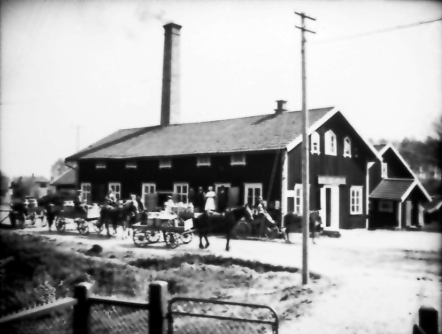 Mejeriet i Floby. På bryggan Ragnar Sundström, John Hermansson, mejerskan Hulda Fält och mejeristen Friberg.