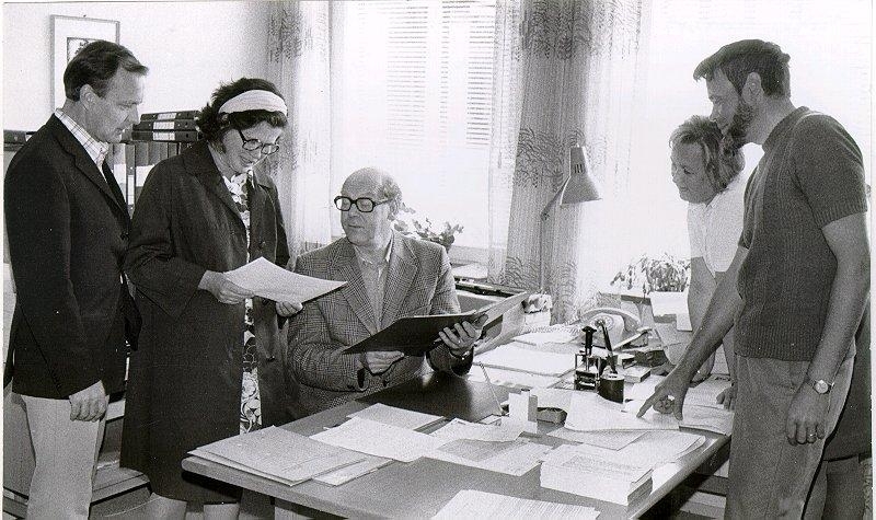 Fredriksbergsskolan. Från vänster: 1. Oidentifierad, 2. Kerstin Ulf, 3. Rektor Landrén, 4. Lilian ?, 5. Wales Karlsson.