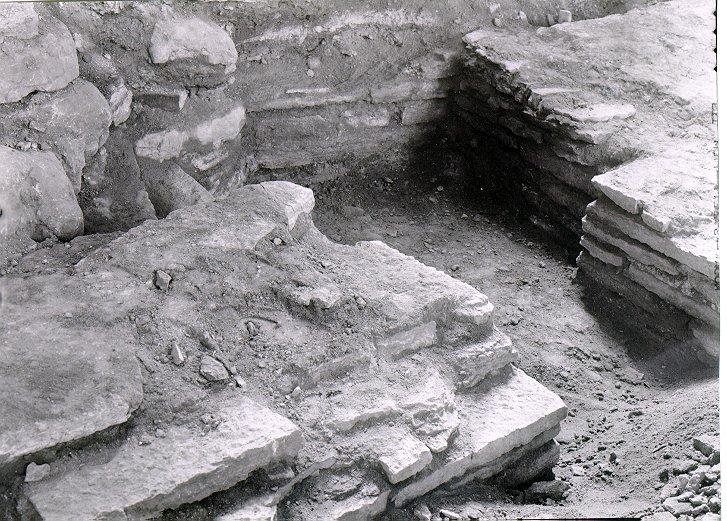 S:t Olofs kyrka. Restaureringen 1958-1961. Romanska torngrunden nedre delen av trapphuset. Foto från nordost. Romanska torngrunden. Trappan i södra muren. Vid A och B dörranslag, vid C trappspindel. Foto från väst.