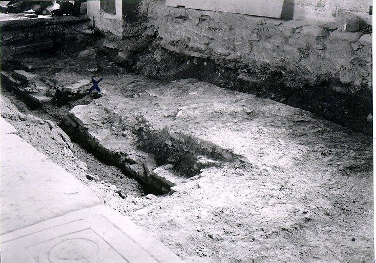 S:t Olofs kyrka. Restaureringen 1958-1961. Romanska torngrunden. Södra delen och sydvästra.hörnet. Foto från nordväst. Trappspindeln vid x ännu ej utgrävd.
