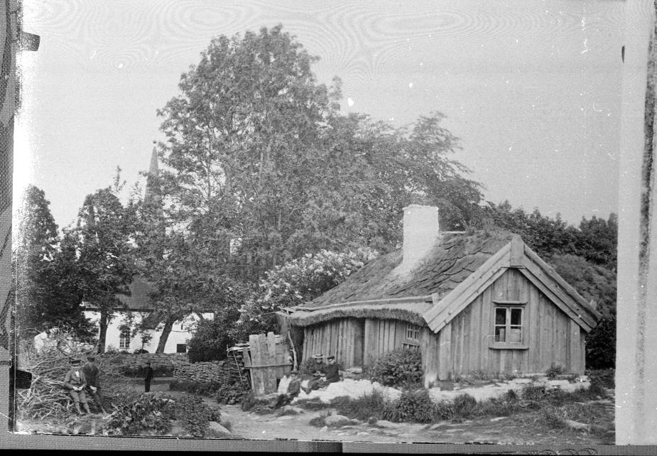 "Knallas" stuga med Kungslena kyrka i bakgrunden.