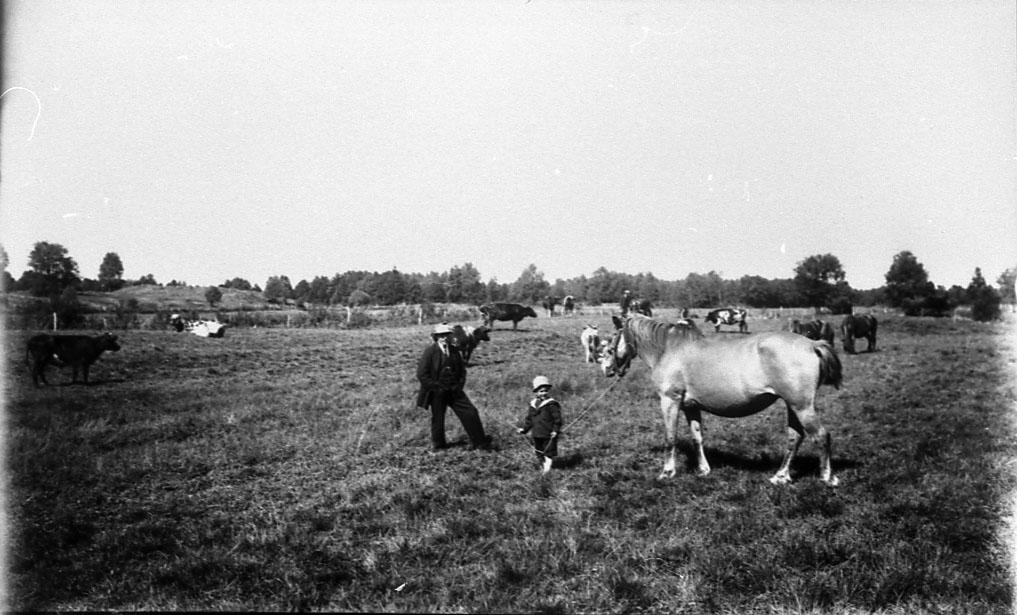Sigfrid Hansson med sonen Åke på Johannelund. Troligen också Greta Karlsson och brodern Herbert, som arbetade här på den tiden.