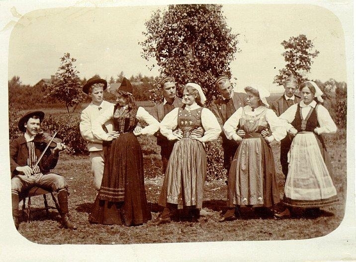 Amatörer ur Logen Falbygden. Från vänster: Spelman Knut Larsson, 1. Fritiof Fahlström, 2. Elida Sandström, 3. Conrad Gustafsson, 4. Stina Fahlström, gift Jacobsson, 5. Mårten Jacobsson, 6. Villy Berggren, gift Gustafsson, 7. Oidentifierad, 8. Ella Karlsson.