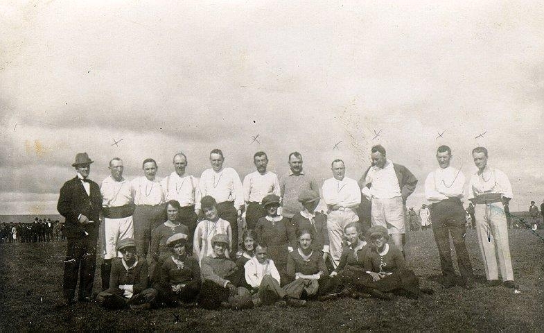 Fotbollslag på Hästbacken. Troligen 1921. I samband med idrottsbasar. Första raden från vänster: 1. Elin Johansson, 2. Alice Sahlgren, 3. Greta Sahlgren, 4. Alice Nyberg, 5. Harry Kronvall, 6. Greta Eriksson g. Andersson, 7. Ingrid Svensson g. Larsson, 8. Stina Johansson, 9. Oidentifierad, 10. Rut Persson g. Hardeman. Stående: 1. Fotbollsdomare Beckman, Tidaholm, 2. Köpman Karl Plith, 3. Skräddaremästare Georg Landén, 4. Skohandlare Gösta Andersson, 5. Badmästare Fritz Henriksson, 6. Rörnätsförman Axel Nyberg, 7. Skräddarmästare Knut Larson, 8. f.d. Sergeant Torsten Gustavsson, 9. Köpman Vilhelm Brandt, 10. Vedhandlare Oskar Gustavsson, 11. Ivar Brolin, Kassör.