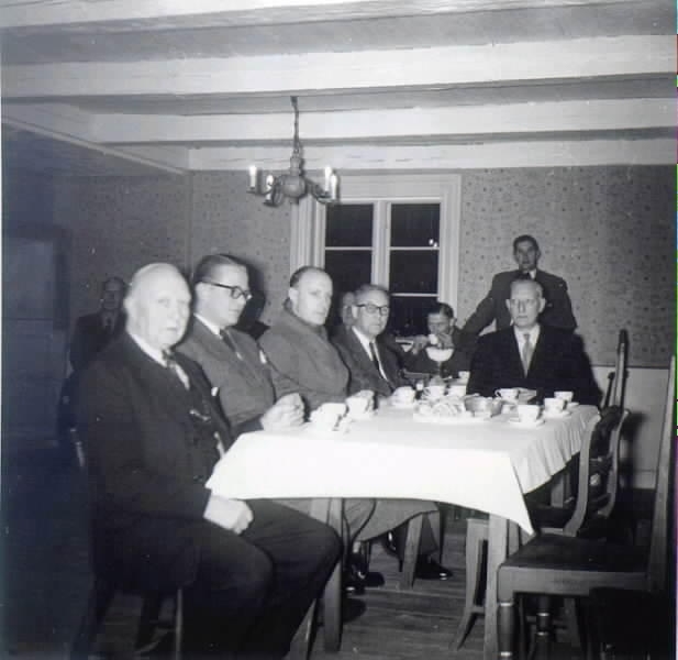 Falbygdens Hembygds- och fornminnesförening. Första styrelsemötet i Kavlåsstugan 1962-1964. Karl Plith, Arvid Vrang, Knut Fredriksson, Olle Karlsson. 2:a raden: E. Danielsson, Dr. Pettersson?, Lars Bergkvist, John Liedholm, G.G. Ingemar, Ernst Ruud.