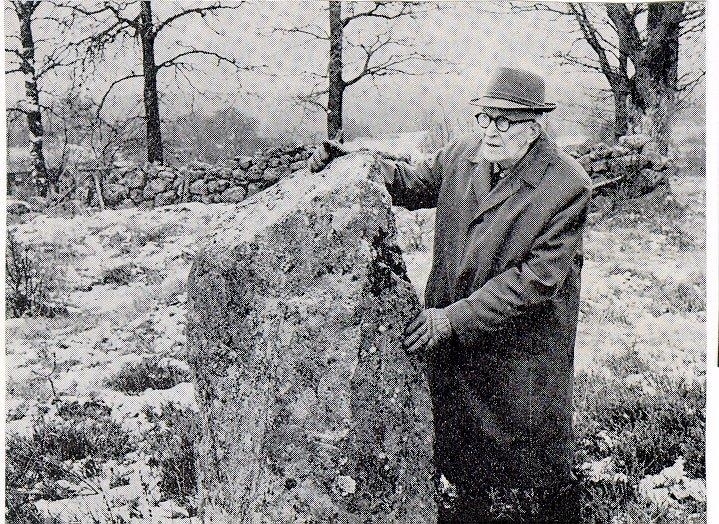 Hällstads sn. Gustav Källman ute i fältet, vid en av domarringsstenarna i Brunstorp i Hällstad.