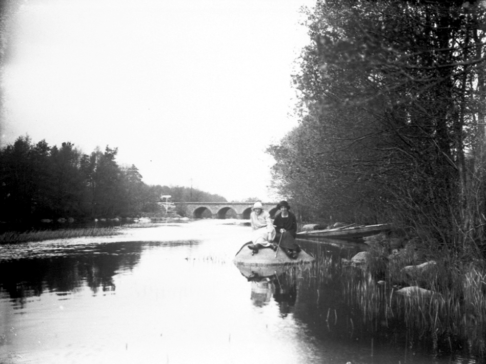 Titel: Järnvägsbron över Lidan vid Buckarp. På skykten står det Länsgräns. På stenen sitter Karin Andersson, och Ingrid Ottergren.