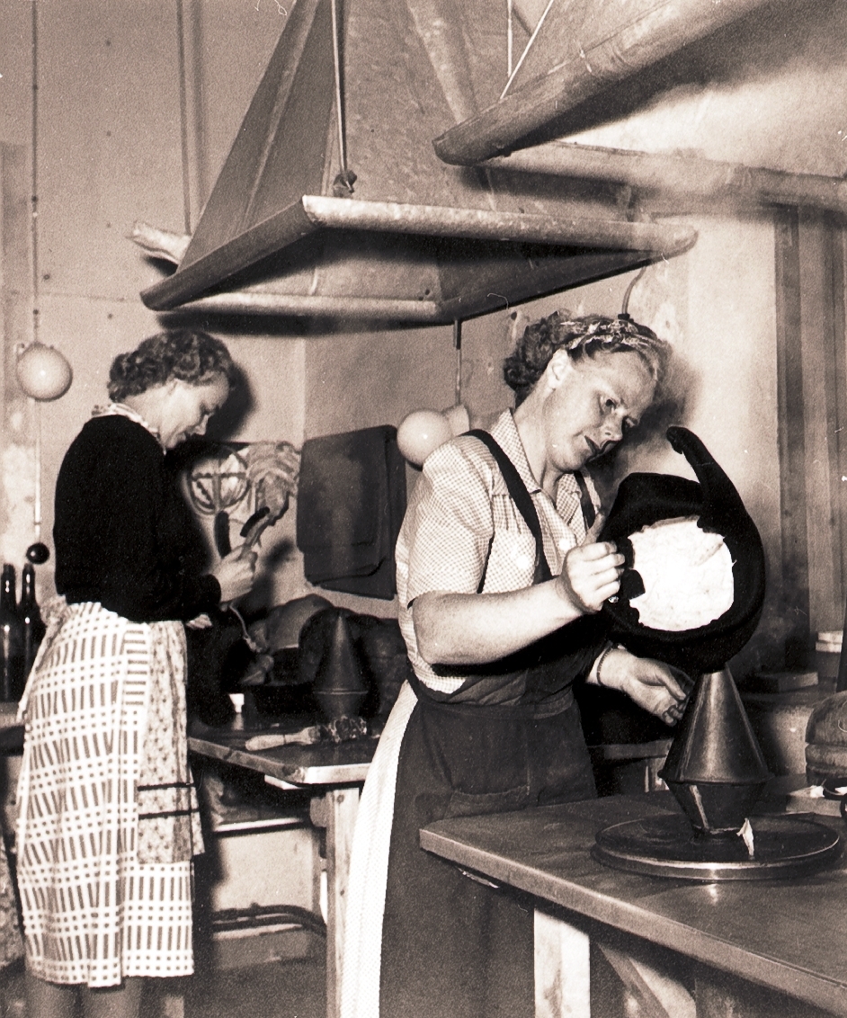 "Fröken Barbro Gustavsson och fru Britta Lundqvist ångar hattar". Från utställningen "Falköping i bild" 1952.