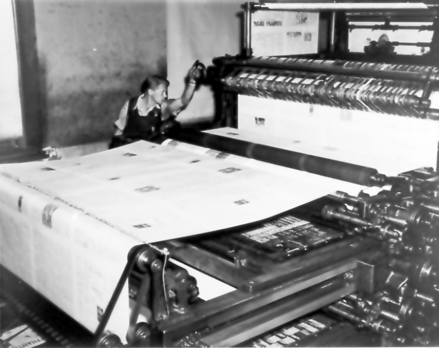 "Tidningen går i press". Tryckare Bror Bernsand (Falköpings tidning). Från utställningen "Falköping i bild" 1952.