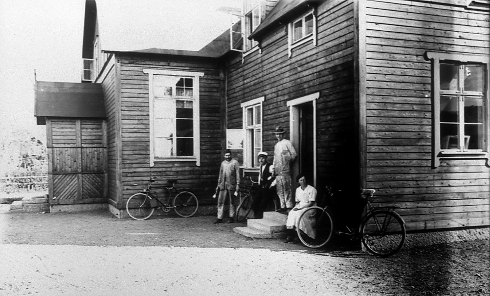 EFS-kapellet i Kommevalla. På trappan Anna Setterberg, på cykeln Anton Setterberg. De två målarna troligen från Skövde.