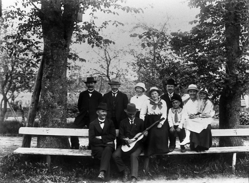 På Veken. Främre raden Gideon Gustavsson Glömme, Ruldolf Selander. Bakom Sanfrid gustavsson Glömme, Sanfrid, Berta, Ebba, Gustav och Olle på Veken. Lärarinnan Anny Andersson med okänd flicka.
