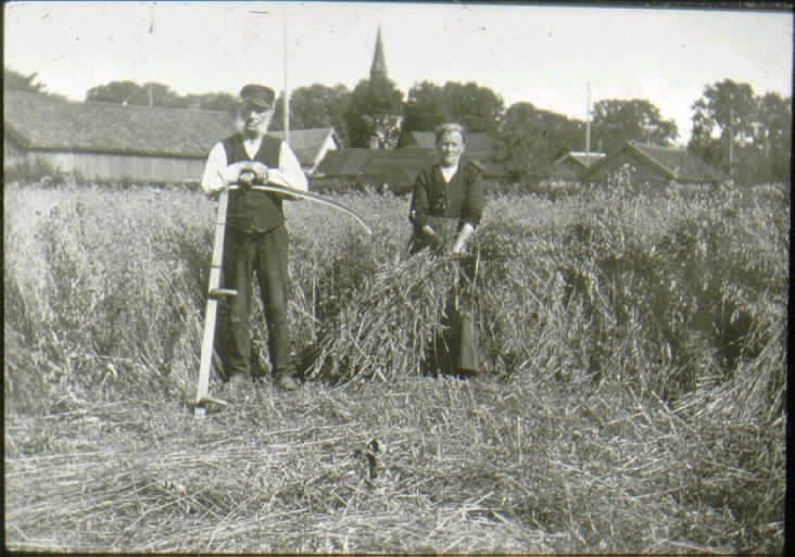 Skräddare Larsson och hans hustru vid Repslagaregatan 33. Skördearbete.