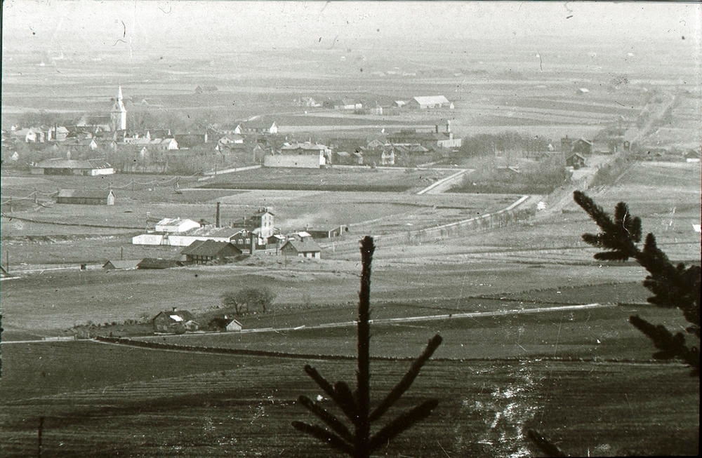 Utsikt från Mösseberg. Överst t.v. S:t Olofs kyrka. Något t.v. om mitten Rantens snickerifabrik. Husen i förgrunden Lejonkullen i hörnet Scheelegatan - Danska vägen.