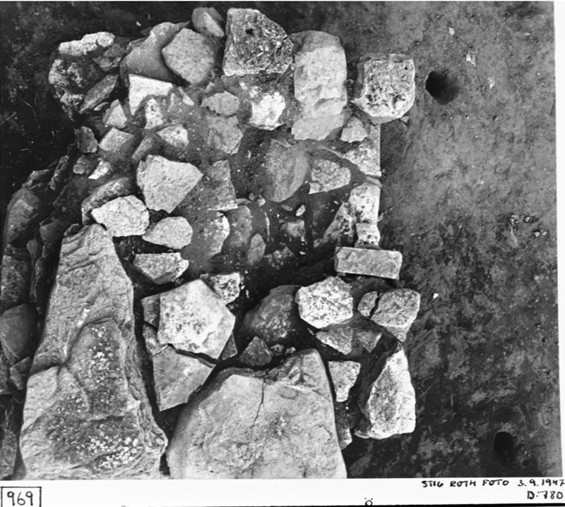 Klostergården. Stengrunden uppifrån. Stolphål.