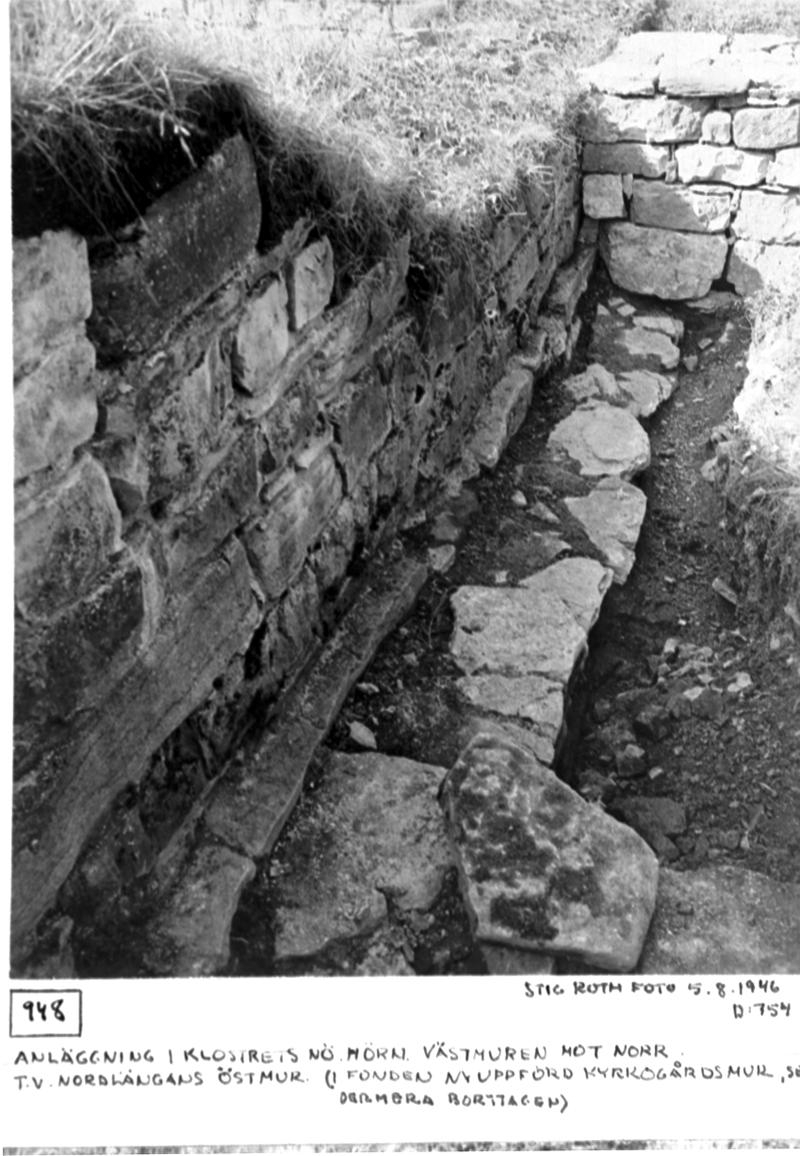 Anläggning i klostrets nordöst hörn. Västmuren mot n. T.v. nordlängans östmur (i fonden nyuppförd kyrkogårdsmur, sedermera borttagen).