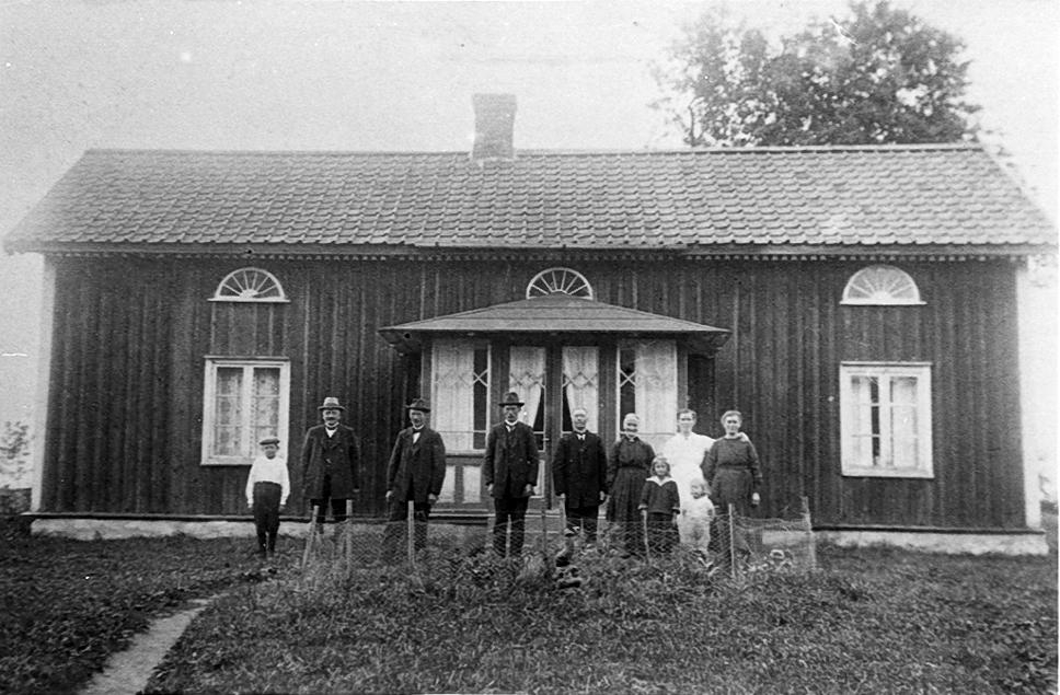 Klockaregården. Huset revs 1925. Einar J., Fredrik J., Klas G., Fritz G., Gustav och Johanna Elvira G., Elin G., Vera J., Ragnar.