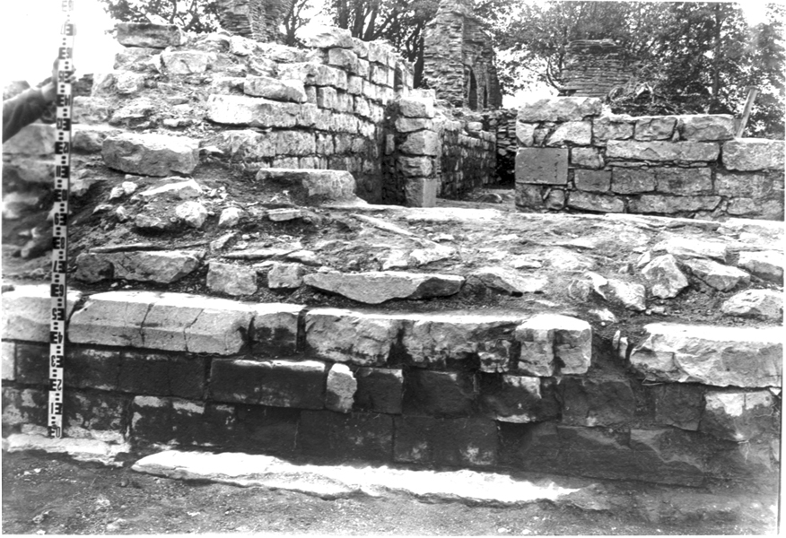 Kyrkan. Koret. Yttre sockellisten. Foto mot väster. Till vänster 0-punkten för all avvägning.