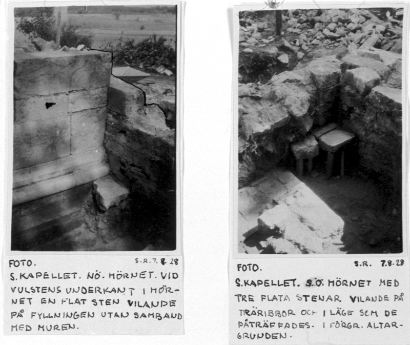 Södra kapellet nordöstra hörnet vid vulstens underkant i hörnet en flat sten vilande på fyllningen utan samband med muren. Södra kapellet sydöstra hörnet med tre flata stenar vilande på träribbor och i läge som de påträffades. I förgrunden altargrunden.