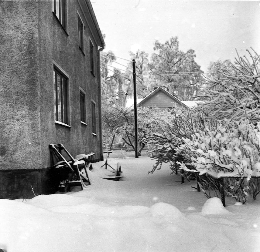Kättilstorp 8 Januari 1968 före VA-arbeten. Torsbos vägg och buskrad.