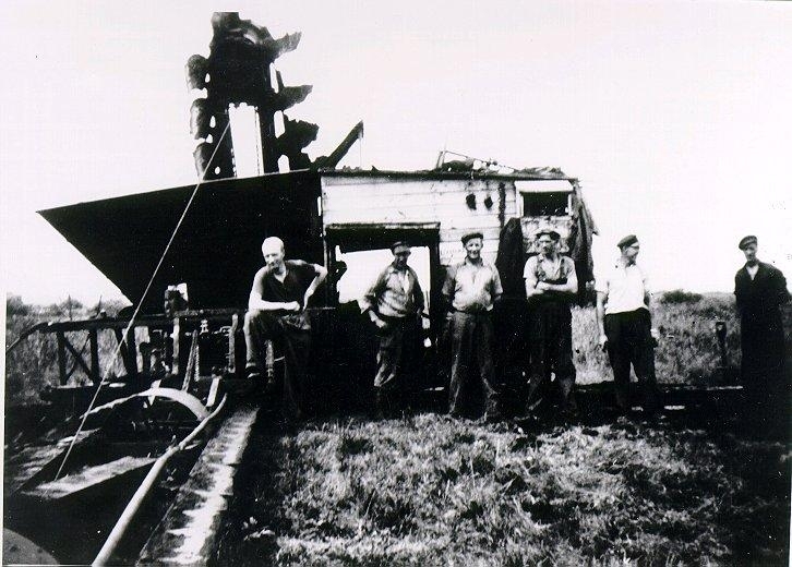 Risholmens mosse. 1950-talets senare del. Torvuppptagning, från vänster: Erik Pettersson (namnbyte nu Oderland),Valter Sandén, Arvid Johansson, Herbert Lindgren, Vidar Sandén och Gustav Lindgren.