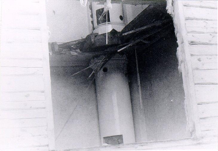 Foto taget genom fönsteröppningen längst till vänster på första våningen. Taget under rivningen. Kakelugnar sådana det var i de fyra rummen. Text: Gunnar Hjerp.