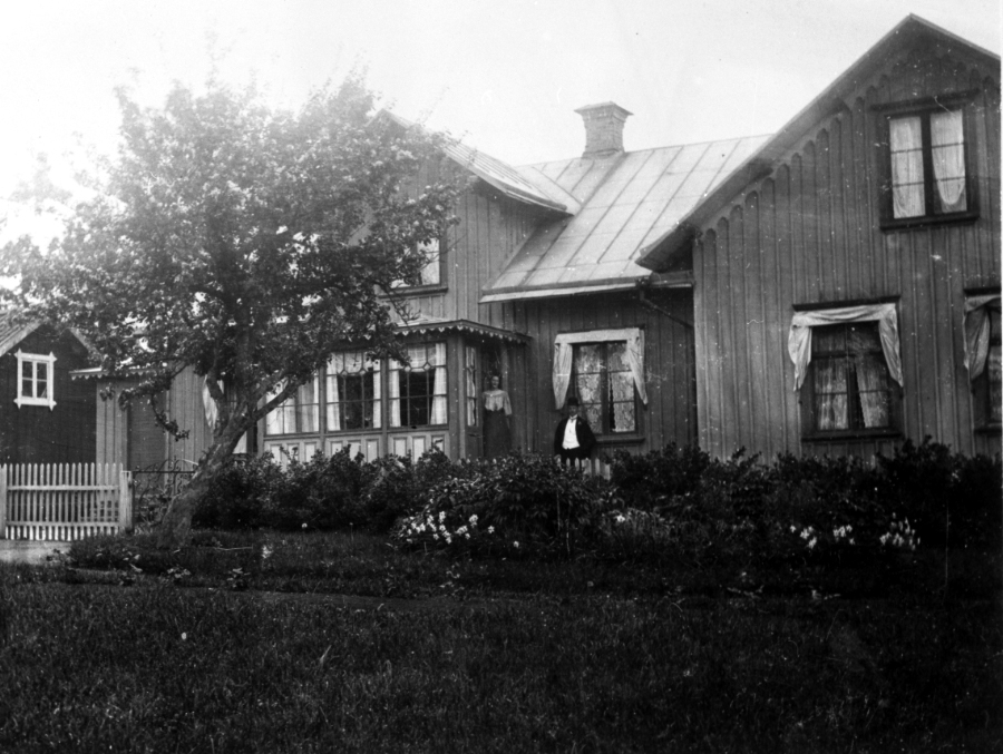 Carl Anderssons bostad, Gertrud och Ture på trappan. Affären till höger. Upphörd och gjord till salong sedan Carolina Aronssons manufakturaffär.