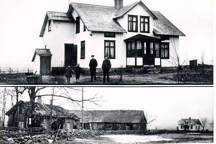 Stommen, Karleby. År 1927 ev. 1928. Från vänster: Ragnhild Oskarsson gift Bonander, Göte Axelsson, Bertil Oscarsson, Erik Oscarsson. Hästar: Bläsa och Stjärna. Erik och Bertil Oscarsson på hästarna.