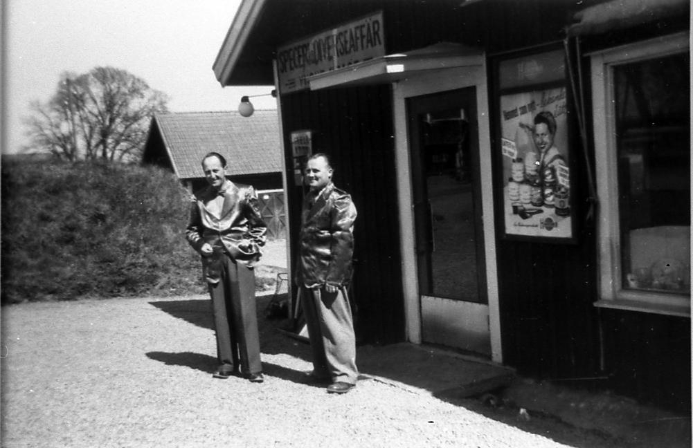 Affären i Leaby. Yngve Brage och Gösta Arvidsson framför butiken.