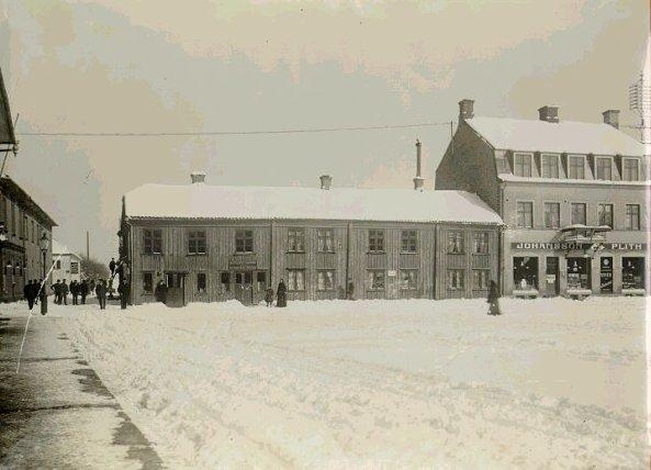 Stora torget. Omkring 1912. Den s.k. Thulins-tomten vid Stora torget. Utanför sin butiksdörr står gamle glasmästare A. Larsson, därnäst (åt höger) är Kristinedals fabriksbod, och ännu längre till höger synes Hilma Brelins vita skylt. Ingången till hennes affär var från gårdssidan. I gatuhörnet står fastighetens ägare byggmästare Emil Gustafson (fr.Motala).