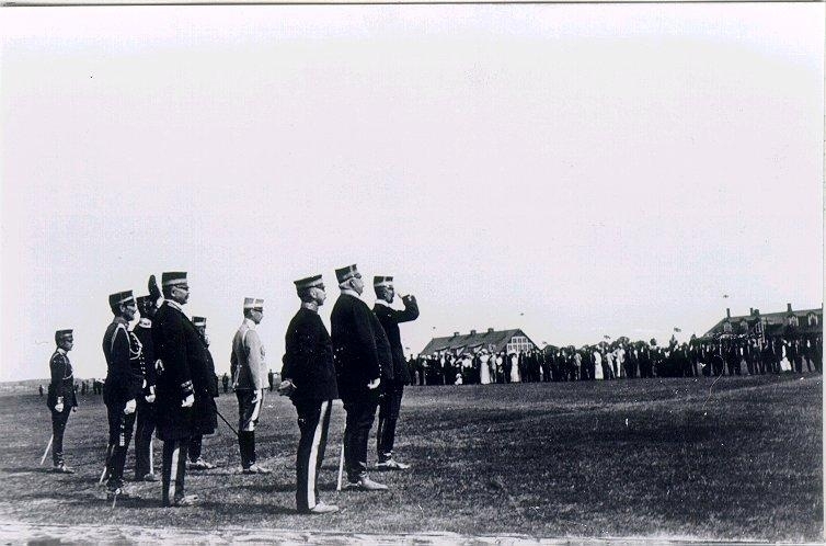 Barnkör från Norra Ving, Axvall uppvaktar Gustav V. I mitten Landshövding de Geer.