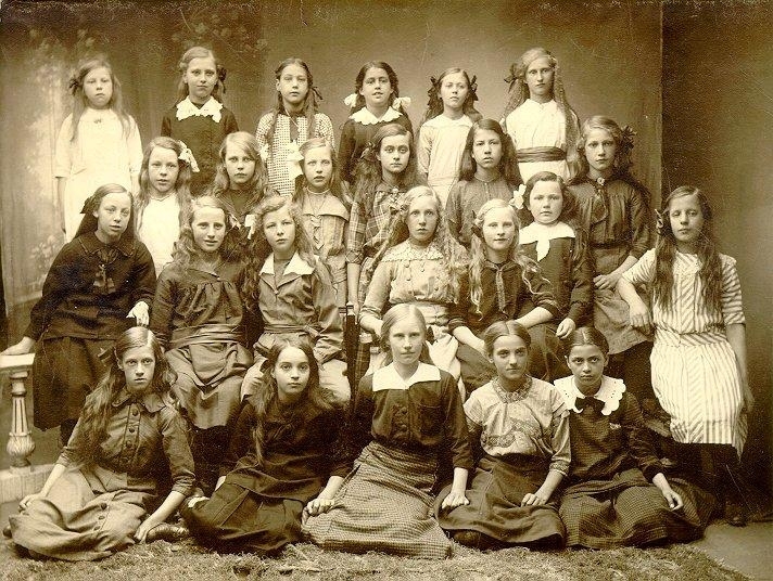 Centralskolan. Folkskolan. Elever. Skolkort 1912-1913. 1:a raden från vänster: 1. Aina Bogren. 2:a raden: 1. Elsa Lind, 2. Märta Lindkvist, 3. Elin Booden, Malmö, 4. Ragnhild Jonsson, 6. Linnea Persson, 7. Svärd. 3:e raden: 6. Rut Borg. 4:e raden: 2. Reymers, 3. Svea Arvidsson, 4. Märta Gustavsson, Göteborg.